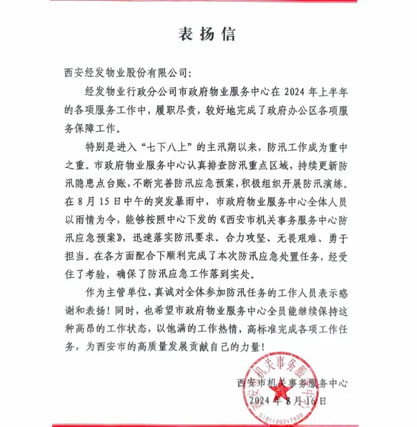 进入“七下八上”主汛期后,防汛工作成为重中之重。经发物业行政分公司高度重视,认真排查防汛重点区域,持续更新防汛隐患点台账,不断完善防汛应急预案,并积极组织开展防汛演练。8月中旬突发暴雨,全体物业人以雨情为令,严格按照《西安市机关事务服务中心防汛应急预案》迅速落实防汛要求,无畏艰难、群策群力,顺利完成防汛应急处置任务,赢得甲方领导广泛好评。在行政办公业态日常服务方面,经发物业持续挖潜服务深度、探索服务边界,在秩序巡逻设备、会议保障流程、保洁作业模式等方面持续迭代升级,为各机关单位、部门在基础保障方面提供了创新、周到的服务,获得各方一致认可。